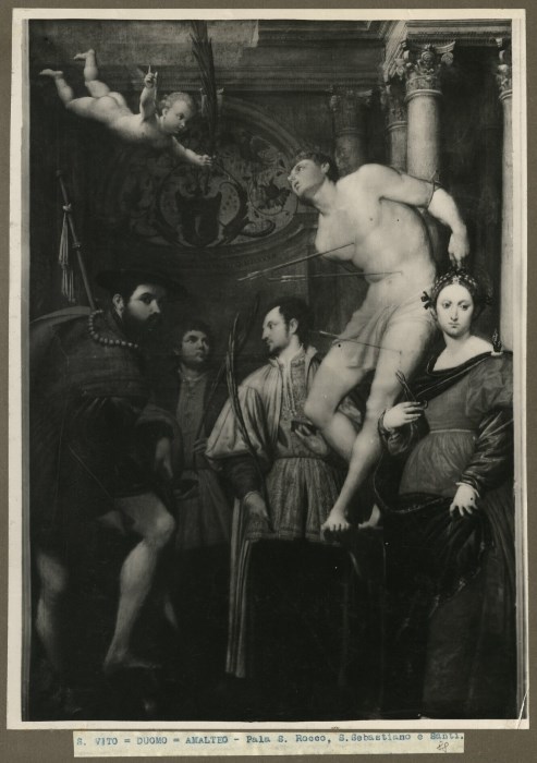 Riproduzione fotografica di una pala raffigurante "San Rocco, San Sebastiano e Santi" a opera di Pomponio Amalteo e conservata presso la Chiesa dei Santi Vito, Modesto e Crescenzia, ovvero il Duomo di San Vito al Tagliamento.