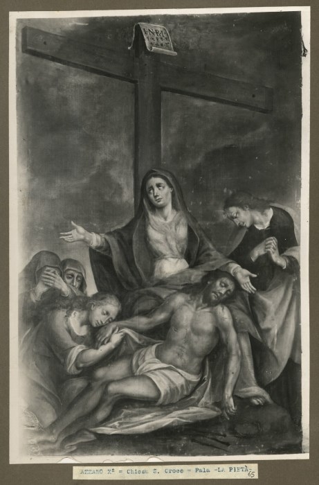Riproduzione fotografica di una pala dipinta raffigurante "La Pietà" e conservata presso la Chiesa di Santa Croce ad Azzano Decimo.