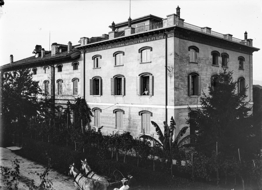 Veduta di una palazzina, forse un albergo, al Montecatini Terme; in basso un calesse trainato da due cavalli ed un uomo, il conducente, ed una donna seduti.