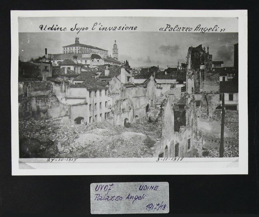 Udine, piazza XX Settembre: veduta di parte della città di Udine dopo l'invasione austriaca nel corso della prima guerra mondiale, tra la Battaglia di Caporetto e il giorno della firma dell'armistizio di Villa Giusti. In primo piano, i resti di Palazzo Angeli nell'isolato tra piazza XX Settembre, via Nazario Sauro, via Cavour e via Paolo Canciani (la famiglia Angeli era entrata a un certo punto proprietaria del fondo territoriale prima dei Torriani). In secondo piano a sinistra, il castello e il campanile della chiesa di Santa Maria di Castello.