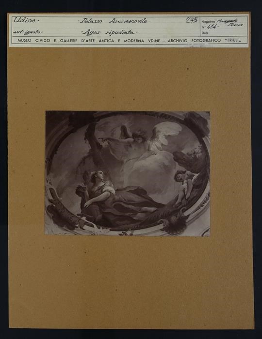 Udine, palazzo Arcivescovile, Galleria degli ospiti: affresco, entro una cornice ovale, che rappresenta Agar e Ismaele nel deserto confortati dall'angelo, di Giambattista Tiepolo (1727-1728). Agar, a sinistra, rivolge lo sguardo all'angelo che le indica la strada da prendere, mentre Ismaele si trova a destra.