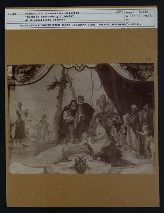 Udine, palazzo Arcivescovile, Galleria degli ospiti: affresco sulla parete, entro una cornice mistilinea, dal titolo "Rachele nasconde gli idoli", di Giambattista Tiepolo (1727-1728). L'anziano Labano si dirige verso la figlia Rachele, la quale è seduta sulla sella del cammello che nasconde gli idoli. A destra è presente Lia, moglie di Giacobbe, che tiene un'anfora.