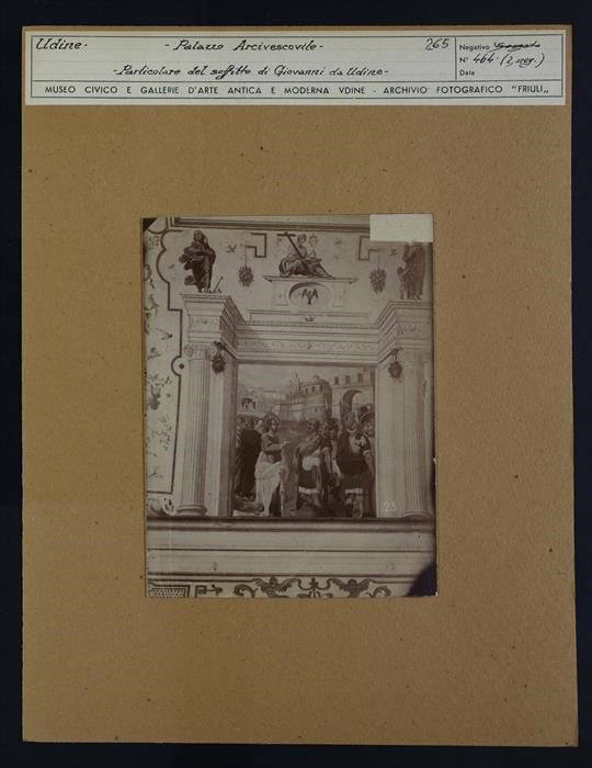 Udine, palazzo Arcivescovile, Sala azzurra (o del Baldacchino) al secondo piano: affresco di Giovanni da Udine con una scena della vita di Cristo (riferita al Nuovo Testamento) sulla volta (1558-1560), entro un riquadro contenuto all'interno di un'architettura disegnata, caratterizzata da due colonne di ordine ionico.