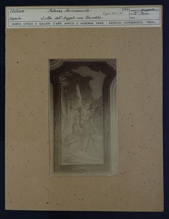 Udine, palazzo Arcivescovile, Galleria degli ospiti: affresco (a monocromo su fondo dorato) sulla parete, entro una cornice mistilinea, che rappresenta la lotta tra l'angelo e Giacobbe, di Giambattista Tiepolo (1727-1728).