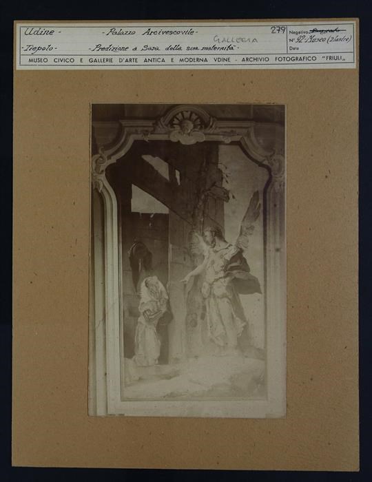 Udine, palazzo Arcivescovile, Galleria degli ospiti: affresco entro una cornice mistilinea che rappresenta "L'Apparizione dell'angelo a Sara", di Giambattista Tiepolo (1727-1728). Sara, inginocchiata, viene informata dall'angelo della sua maternità (secondo l'episodio della Genesi).