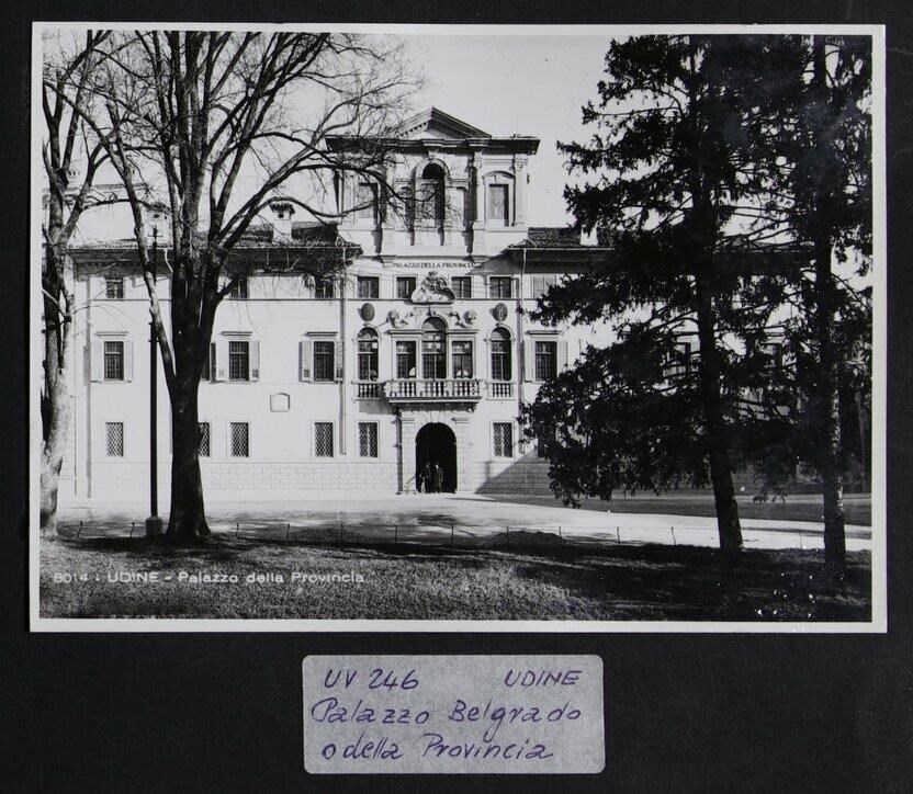 Udine, piazza Patriarcato: veduta di Palazzo Antonini-Belgrado (fine del Seicento), prima di proprietà della famiglia Antonini, poi della famiglia Belgrado. Nel 1891 diventò sede dell’Amministrazione provinciale di Udine. In basso al centro, due uomini all'ingresso, di cui uno con una bicicletta.