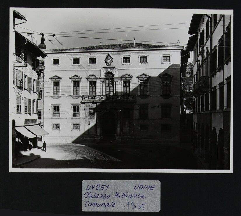 Udine, piazza Guglielmo Marconi: veduta della facciata di Palazzo Dragoni-Bartolini, sede della Biblioteca Civica "Vincenzo Joppi" dal 1866. Sono presenti nella piazza le rotaie del tram.