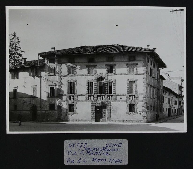 Udine: veduta di Palazzo Montegnacco-Berghinz-De Concina tra via Francesco Mantica e via Anton Lazzaro Moro, in pietra piasentina e bugnato rustico. L'edificio, che in origine venne fatto costruire dal conte Girolamo di Montegnacco, ospitò il generale Armando Diaz.
