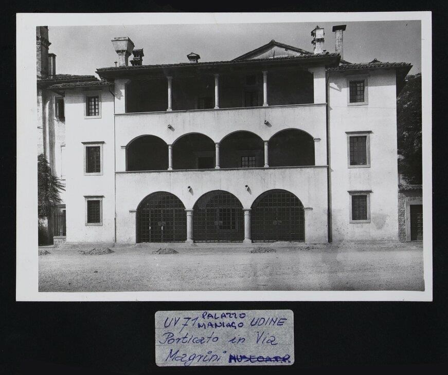 Udine, via Magrini: loggia di Palazzo Gorgo-Maniago (XVI secolo). La loggia si sviluppa su tre piani con colonne che sostengono, al piano terra e al primo, grandi arcate a tutto sesto in muratura. Il complesso, in origine di proprietà della famiglia vicentina dei Gorgo, è formato, oltre che dalla loggia, dal corpo centrale e da due ali laterali. Nel piano nobile per un certo periodo viene accolto il Museo Friulano delle Arti e Tradizioni Popolari.