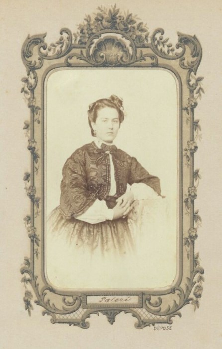 Ritratto in studio della signora Paleri con abito ottocentesco appoggiata ad un tavolo ricoperto da una tovaglia.