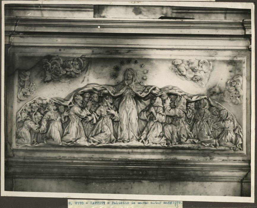 Riproduzione fotografica del paliotto in marmo dell'altare maggiore e raffigurante la "Beata Vergine che protegge con il suo manto" conservato presso la Chiesa di Santa Maria dei Battuti a San Vito al Tagliamento.