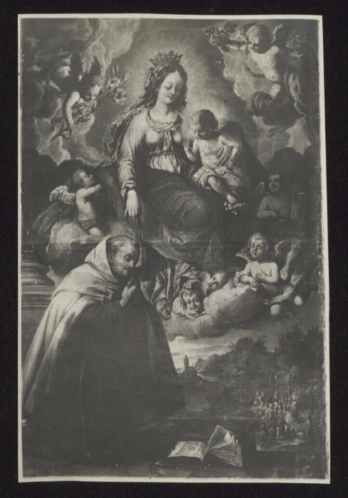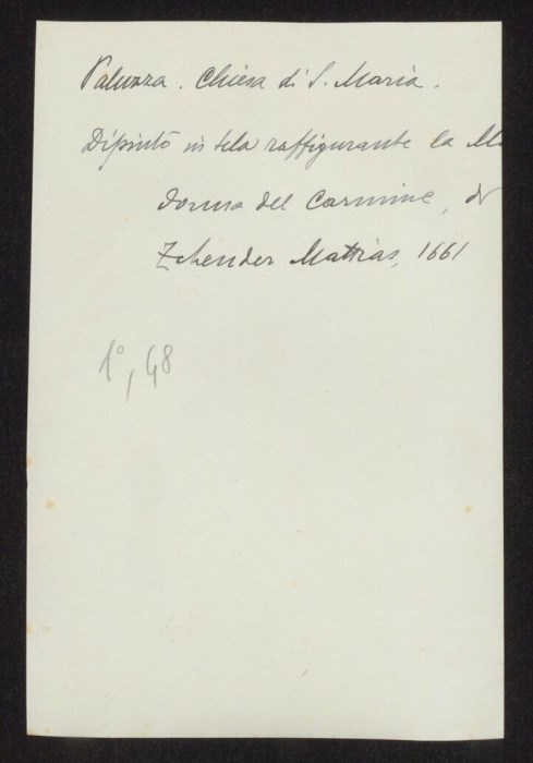 Tela raffigurante la Madonna col Bambino in gloria ed un Santo conservata presso la chiesa di S. Maria a Paluzza. Dall'iscrizione sul verso della fotografia il dipinto è attribuito al pittore Zchender Mattias e datato 1661.