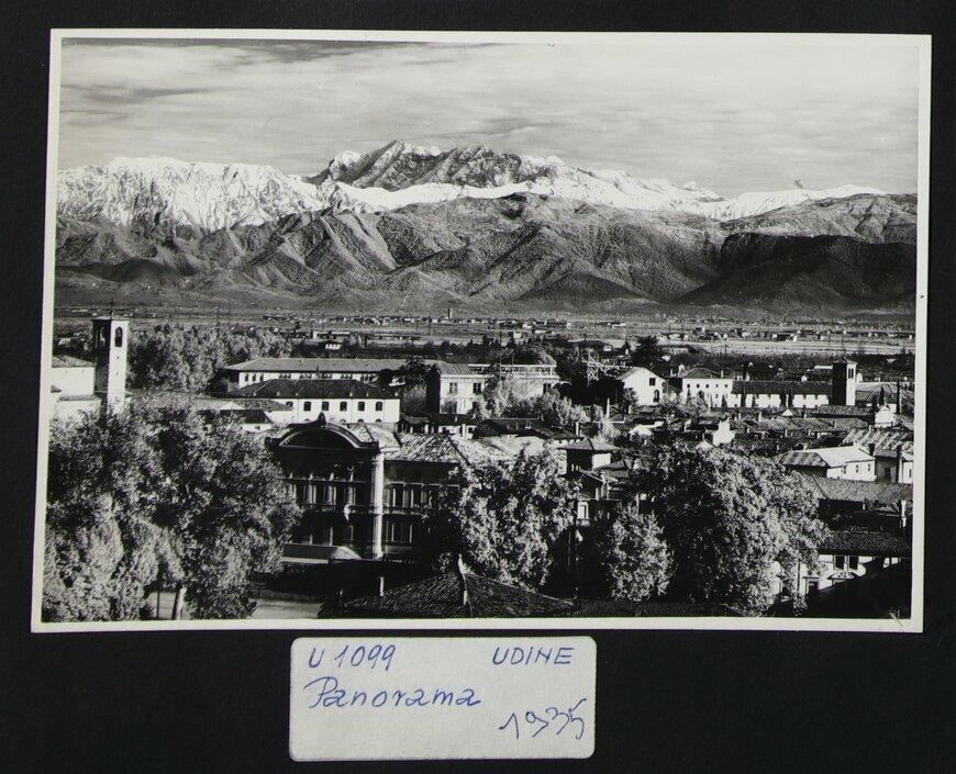 Udine: veduta della città e dell'hinterland con le Alpi. In primo piano a sinistra, il liceo classico statale "Jacopo Stellini" nel palazzo finito di costruire nel 1915 che aveva anche accolto il Comando supremo militare italiano (dal 1919 diventò definitivamente sede del liceo). All'estrema sinistra, il santuario della Beata Vergine delle Grazie. Il pronao (1838-1841, 1850-1851), con timpano e quattro colonne (in pietra bianca di Brioni), è stato progettato dall'architetto Valentino Presani.