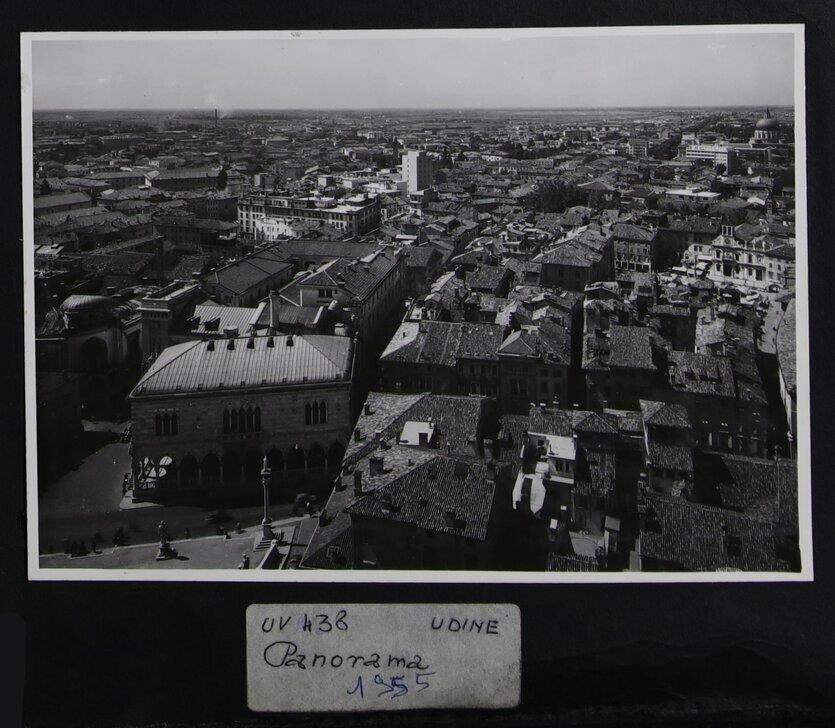 Udine: veduta aerea della città. In primo piano a sinistra, in piazza Libertà si vedono la Loggia del Lionello finita di costruire per volere di Nicolò Lionello, la colonna con la statua della Giustizia dello scultore Girolamo Paleari (1612), il monumento alla Pace (in riferimento al Trattato di Campoformido) di Giovanni Battista Comolli (trasportato a Udine nel 1819) e le statua seicentesca di Ercole in pietra d'Aurisina realizzata dallo scultore Angelo de Putti. All'estrema sinistra, il cinema Eden in stile liberty costruito su progetto dell'architetto Provino Valle (1921) e demolito nel 1958. All'estrema destra, la facciata della chiesa di San Giacomo (fine del Trecento). Sullo sfondo a destra, la cupola del Tempio Sacrario di San Nicolò (Tempio Ossario), progettato da Provino Valle e Alessandro Limongelli nel 1925 e costruito nel 1931.