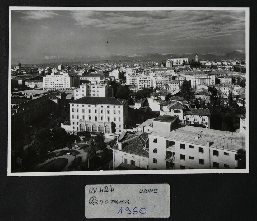 Udine: veduta aerea della città con le Alpi. In primo piano, uno scorcio del Giardino "Giovanni Pascoli" progettato da Ettore Gilberti (inizi degli anni Trenta del Novecento), in origine chiamato "Giardini pubblici Arnaldo Mussolini", e la Casa del Littorio, costruita sotto la direzione dei lavori di Ettore Gilberti (1931-1932). A destra, Palazzo del Torso dell'architetto Provino Valle (1925-1926), sito in via Carducci 44. Vicino, la casa e bottega del fotografo Attilio Brisighelli e Palazzo Vuga di Ettore Gilberti (1910). Sullo sfondo, verso destra, il castello, il campanile della chiesa di Santa Maria di Castello, la Torre dell'Orologio di Giovanni da Udine (1527) che si innesta sulla Loggia di San Giovanni e il campanile del duomo (prima metà del Duecento). A sinistra, sempre sullo sfondo, la cupola del Tempio Sacrario di San Nicolò (Tempio Ossario), progettato da Provino Valle e Alessandro Limongelli nel 1925 e costruito nel 1931.