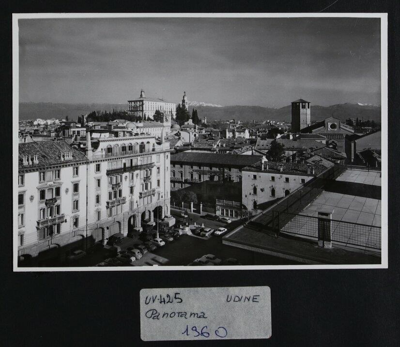 Udine: veduta aerea della città con le Alpi. In primo piano, una parte di piazza XX Settembre (chiamata un tempo "piazza dei grani"). A destra, la Casa Veneziana, realizzata in stile gotico, in origine di proprietà dei conti di Montegnacco e posizionata in via Rialto, che nel 1910 viene smontata - per accogliere la nuova sede del Municipio - e ricomposta nel 1929 in piazza XX Settembre. A sinistra in primo piano, Palazzo INA, realizzato su progetto di Provino Valle con la collaborazione di Pietro Valle (1921-1924); si noti il portico del pianoterra, contraddistinto dal bugnato. Sullo sfondo, verso sinistra, il castello, il campanile della chiesa di Santa Maria di Castello e la Torre dell'Orologio di Giovanni da Udine (1527), che si innesta sulla Loggia di San Giovanni. A destra, il duomo e il campanile (prima metà del Duecento).