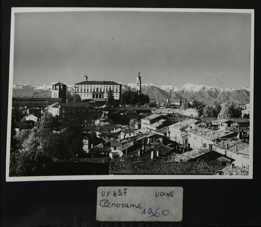 Udine: veduta aerea di uno scorcio della città con le Alpi. Sullo sfondo, il castello, il campanile della chiesa di Santa Maria di Castello, il duomo e il campanile (prima metà del Duecento).