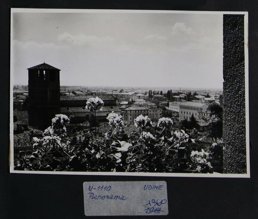 Udine: veduta aerea della città dall'interno di un edificio. In primo piano, fiori da balcone. A sinistra, il campanile del duomo (prima metà del Duecento). Sullo sfondo, l'hinterland.