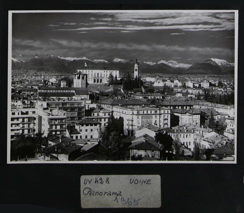 Udine: veduta aerea di uno scorcio della città con le Alpi. Verso il centro, il castello, il campanile della chiesa di Santa Maria di Castello, il duomo e il campanile (prima metà del Duecento).