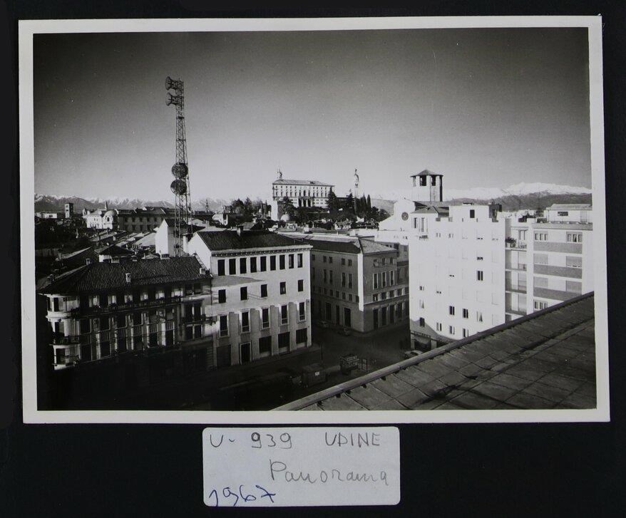 Udine: veduta aerea di parte della città. Sullo sfondo, le Alpi. In primo piano, piazza Venerio quando era la stazione della corriere: si noti il Palazzo della società Telve, progettato dall'ingegnere Mario Pitacco e dall'architetto Cesare Scoccimarro, affacciato su piazza Venerio (la società finì sotto il controllo della SIP). All'esterno dell'edificio, il bassorilievo di Dino Basaldella realizzato nel 1945. In secondo piano a destra, il duomo (prima metà del Duecento). Al centro, in lontananza, il castello e il campanile cinquecentesco della chiesa di Santa Maria di Castello progettato da Gaspare Negro, con la scultura dorata e girevole rappresentante l'arcangelo Gabriele, in cima alla cupola emisferica portata a termine da Giovanni da Udine. Svetta, in secondo piano a sinistra, un'antenna per ricevere onde radio. Sullo sfondo a sinistra, il campanile della chiesa di San Pietro Martire (riconsacrata nel 1483, dopo la ricostruzione dell'edificio).