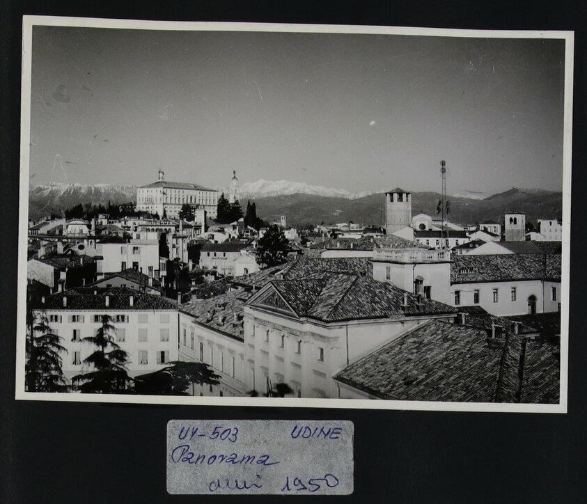 Udine: veduta aerea di uno scorcio della città con le Alpi. A sinistra il castello, il campanile della chiesa di Santa Maria di Castello e la Torre dell'Orologio di Giovanni da Udine (1527) che si innesta sulla Loggia di San Giovanni. A destra, il duomo (prima metà del Duecento) e il campanile della chiesa di San Francesco (seconda metà del XIII secolo).