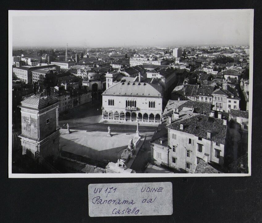Udine: veduta da una finestra del castello della città. In primo piano a sinistra, la Loggia di San Giovanni, in cui si innesta la Torre dell'Orologio, di Giovanni da Udine (1527), sita in piazza Libertà. In piazza Libertà si vedono la colonna con la statua della Giustizia, dello scultore Girolamo Paleari (1612), il monumento alla Pace (in riferimento al Trattato di Campoformido) di Giovanni Battista Comolli (trasportato a Udine nel 1819) e le statue seicentesche di Ercole e di Caco in pietra d'Aurisina, realizzate dallo scultore Angelo de Putti. A sinistra, si intravedono il palazzo del Comune o Palazzo D'Aronco (1911-1930) e il cinema Eden in stile liberty, costruito su progetto dell'architetto Provino Valle (1921) e demolito nel 1958. Più indietro, a sinistra, il campanile della chiesa di San Francesco (seconda metà del XIII secolo). Sullo sfondo, le Alpi.