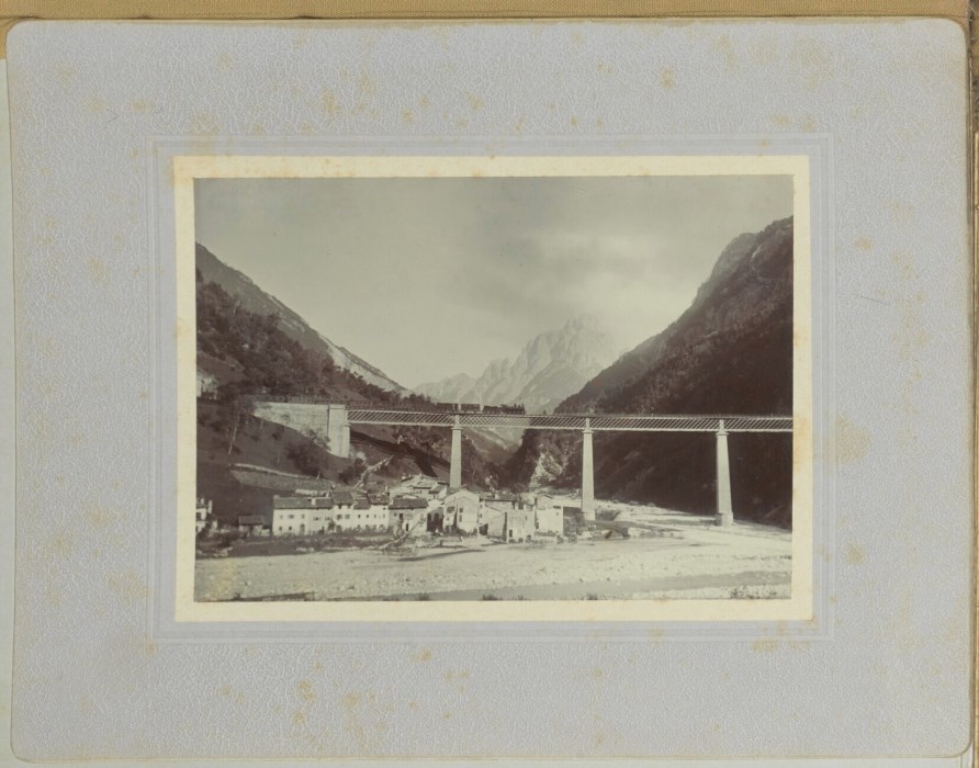 Veduta del paese di Dogna e del torrente omonimo quasi completamente in secca; un treno a vapore con vagoni d passaggio sul ponte ferroviario che sovrasta il paesino. Sullo sfondo si erge maestoso quanto onirico lo Jôf di Montasio.