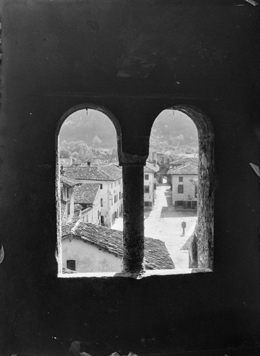 Panoramica delle case di Venzone dall'interno dalla bifora del campanile del Duomo.