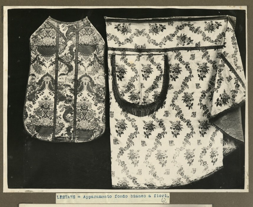 Riproduzione fotografica di due paramenti liturgici con fondo bianco e decorazioni floreali conservati presso la Chiesa di Santa Maria Assunta a Lestans di Sequals.