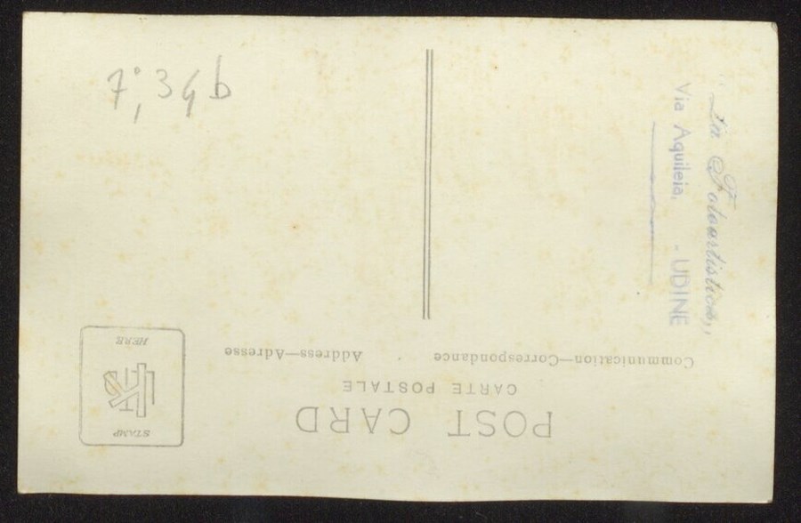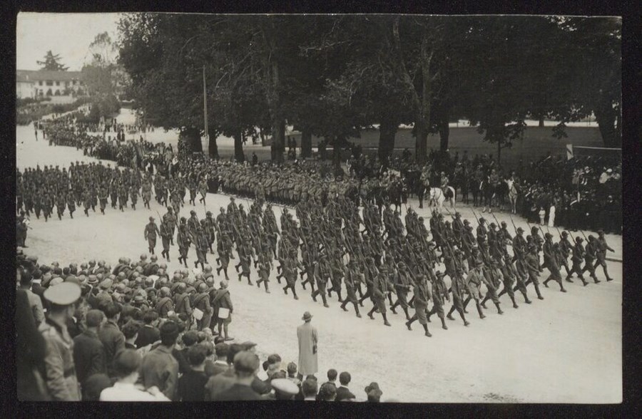 Immagine della sfilata militare in piazzale Umberto I°, oggi piazza Primo Maggio, in occasione della conclusione celebrativa del XII anno dell'era fascista, il 28 ottobre 1934. In un articolo del 27/10/1934 su "Il Popolo del Friuli. Organo del Partito Nazionale Fascista" è possibile conoscere il programma della manifestazione.