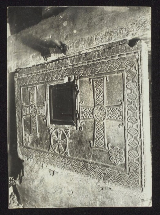 Riproduzione fotografica del particolare della parte retrostante in pietra di Aurisina dell'Ara di Ratchis, ora conservato presso il Museo Cristiano e Tesoro del Duomo a Cividale del Friuli.