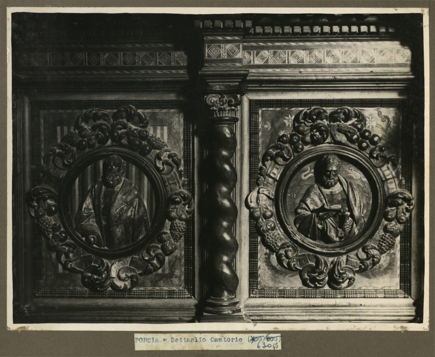 Riproduzione fotografica di un particolare della cantoria in legno intarsiato risalente al 1630 e conservata presso la Chiesa di San Giorgio Martire di Porcia.