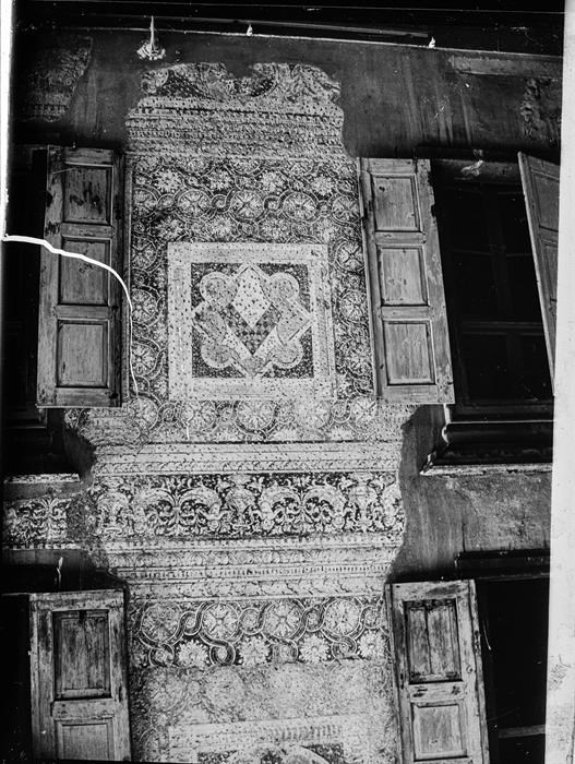 Particolare di una parete di un palazzo nobiliare con decorazione ad affresco; l'affresco, situato tra alcune finestre, è completamente scalfitto.