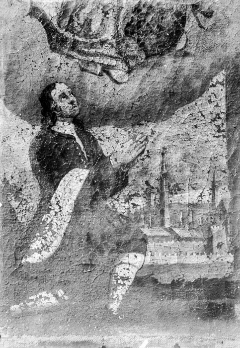 Particolare di un dipinto su tela raffigurante un uomo in ginocchio con le mani conserte in preghiera, sullo sfondo il muro di cinta ed una cittadina.