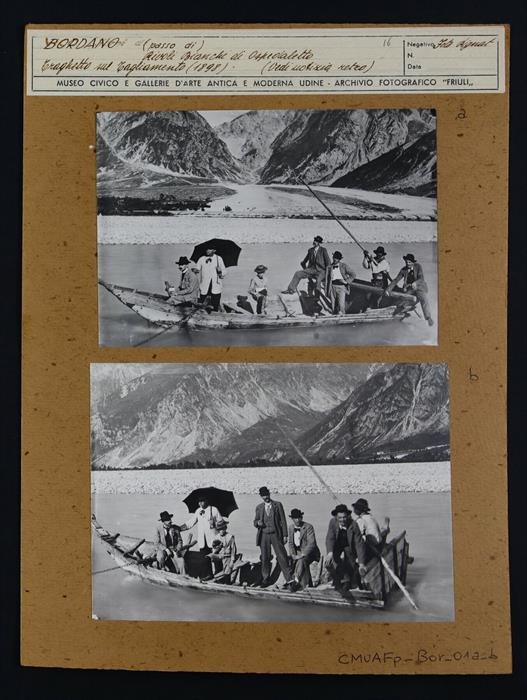 Bordano-Gemona del Friuli, Tagliamento: il passo di barca di Rivoli Bianchi (dall'omonimo torrente) di Ospedaletto ("barcje di Bordan"). Sono rappresentati sette uomini, di cui uno con un ombrello, su un'imbarcazione vicino alle ghiaie dei Rivoli, nei pressi dei monti Ledis e Ambrusèit. Proprio qui viene costruito nel 1875 un viadotto.
