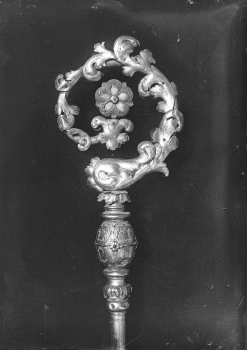 Riproduzione fotografica della parte alta di un pastorale con un riccio formato da foglie e un fiore centrale, posizionato su fondale scuro per la documentazione fotografica.