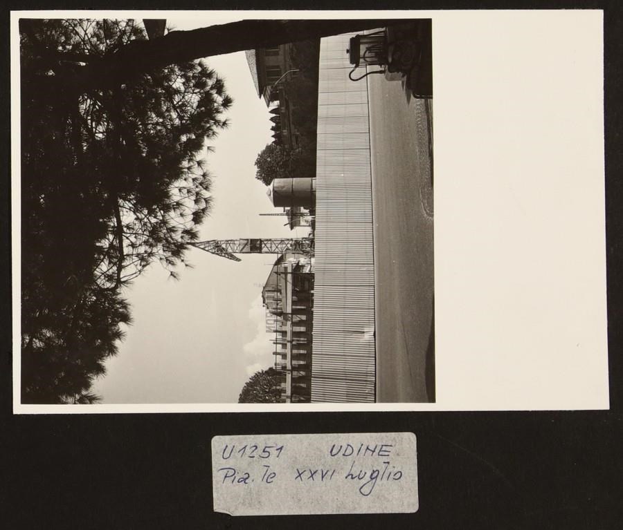 Udine: veduta di piazzale XXVI Luglio. In primo piano, cantiere con una gru per la costruzione del monumento alla Resistenza, realizzato su progetto degli architetti Gino Valle e Federico Marconi (1959-1969). In secondo piano a sinistra, l'insegna della Birra Moretti.