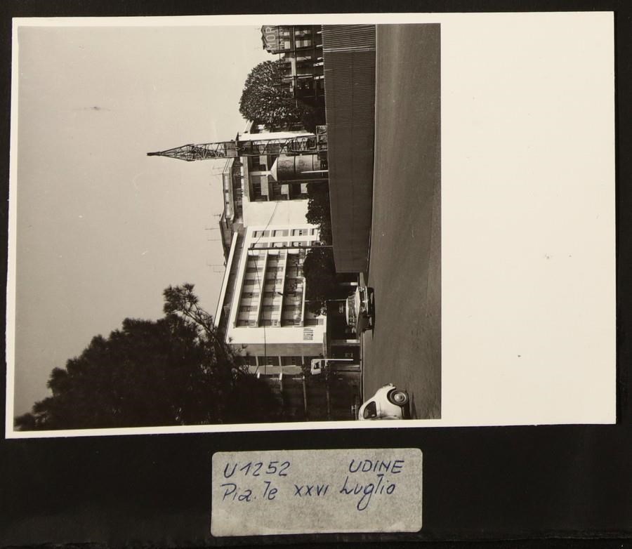 Udine: veduta di piazzale XXVI Luglio. In primo piano, cantiere con una gru per la costruzione del monumento alla Resistenza, realizzato su progetto degli architetti Gino Valle e Federico Marconi (1959-1969). In secondo piano a destra, l'insegna della Birra Moretti. In secondo piano a sinistra, l'insegna dell'Agip.