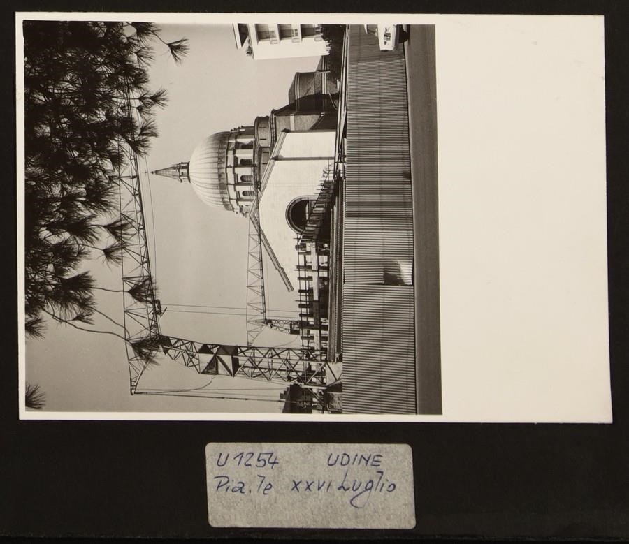 Udine: veduta di piazzale XXVI Luglio. In primo piano, cantiere con due gru per la costruzione del monumento alla Resistenza, realizzato su progetto degli architetti Gino Valle e Federico Marconi (1959-1969). In secondo piano, il Tempio Sacrario di San Nicolò (Tempio Ossario), progettato dagli architetti Provino Valle e Alessandro Limongelli nel 1925 e costruito nel 1931. A sinistra si intravede Palazzo Moretti, annesso allo stabilimento del Birrificio Moretti, progettato dall'architetto Ettore Gilberti (1925-1926).