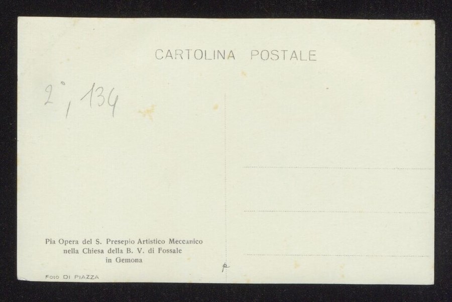 Presepio artistico meccanico nella Chiesa del Santo Nome di Maria, o Santa Maria di Fossale, a Gemona. Si trattava di un presepe meccanico molto grande che attirava molti fedeli anche dai paesi limitrofi e che veniva allestito ogni anno da dicembre a metà febbraio, fino agli anni Quaranta del Novecento. I pastori con i loro greggi arrivavano fino davanti al Bambin Gesù, davanti al quale si piegavano per poi ripartire: le strade erano costituite da tappeti mobili attivati da complicati meccanismi a manovella.