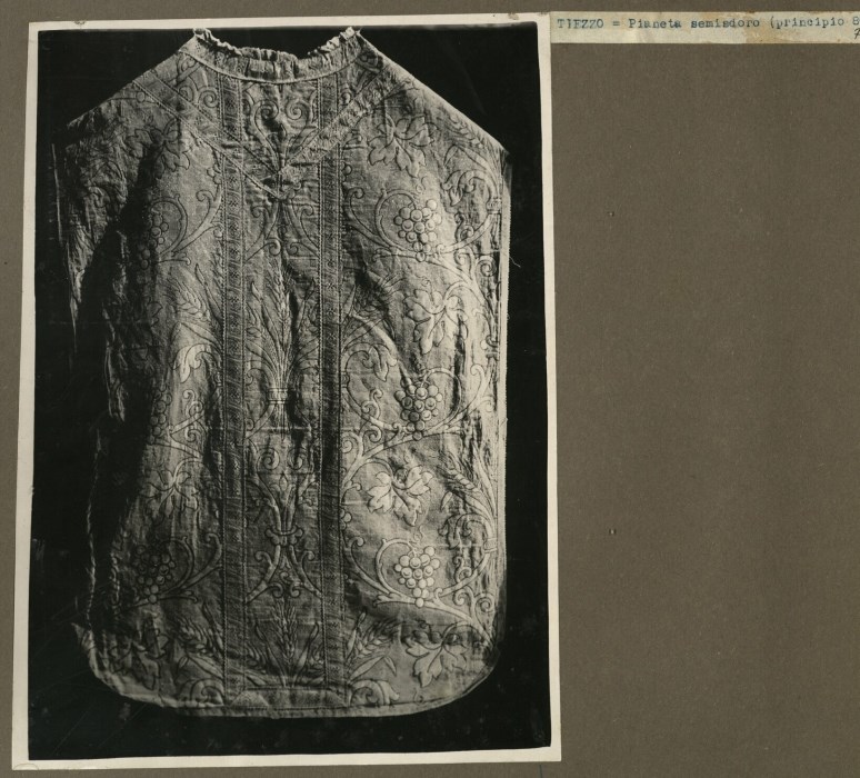 Riproduzione fotografica di una pianeta con motivi floreali e con fili dorati conservata presso Chiesa di San Martino Vescovo a Tiezzo di Azzano Decimo.