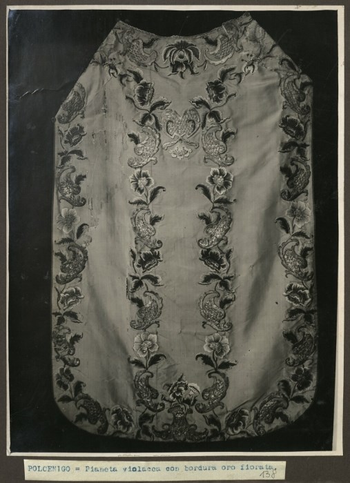 Riproduzione fotografica di una pianeta con motivi floreali ai bordi e, da documentazione, con fondo violaceo conservato presso la Chiesa di San Giacomo Apostolo a Polcenigo.