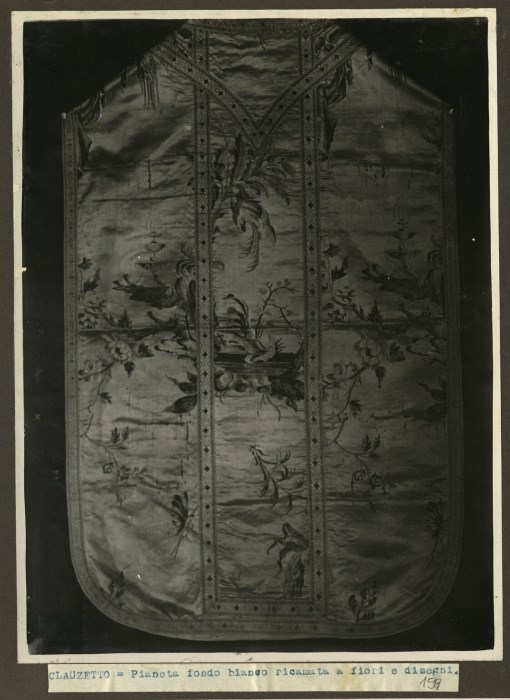 Riproduzione fotografica di una pianeta con fondo bianco, ricami floreali e disegni conservata presso la Chiesa di San Martino a Vito d'Asio.