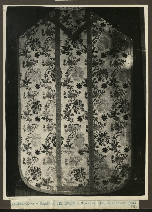 Riproduzione fotografica di una pianeta bianca con motivi floreali conservata presso la Chiesa di San Valentino e Sant′Anna detta Madonna dello Zucco a Castelnovo del Friuli.