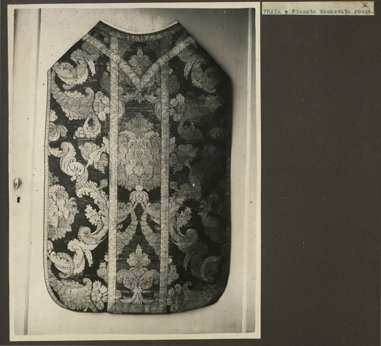 Riproduzione fotografica di una pianeta damascata rossa con motivi floreali conservata presso la Chiesa di Santa Lucia Vergine e Martire di Prata di Pordenone.