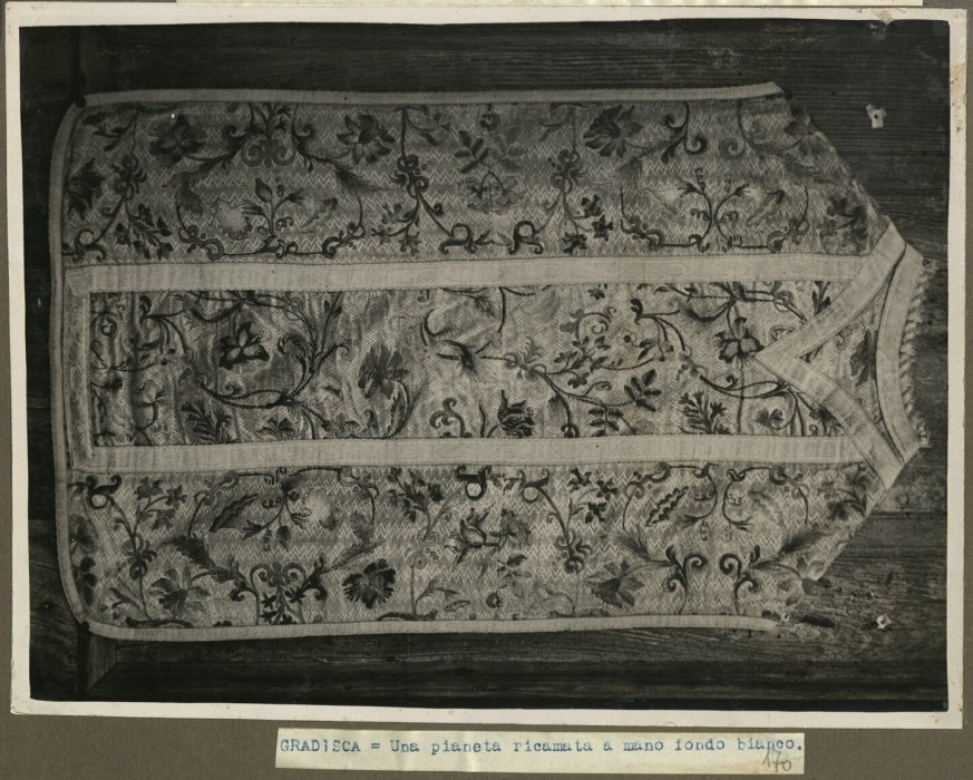 Riproduzione fotografica di una pianeta con motivi floreali su sfondo bianco e conservata presso la Chiesa di Santo Stefano a Gradisca di Spilimbergo.