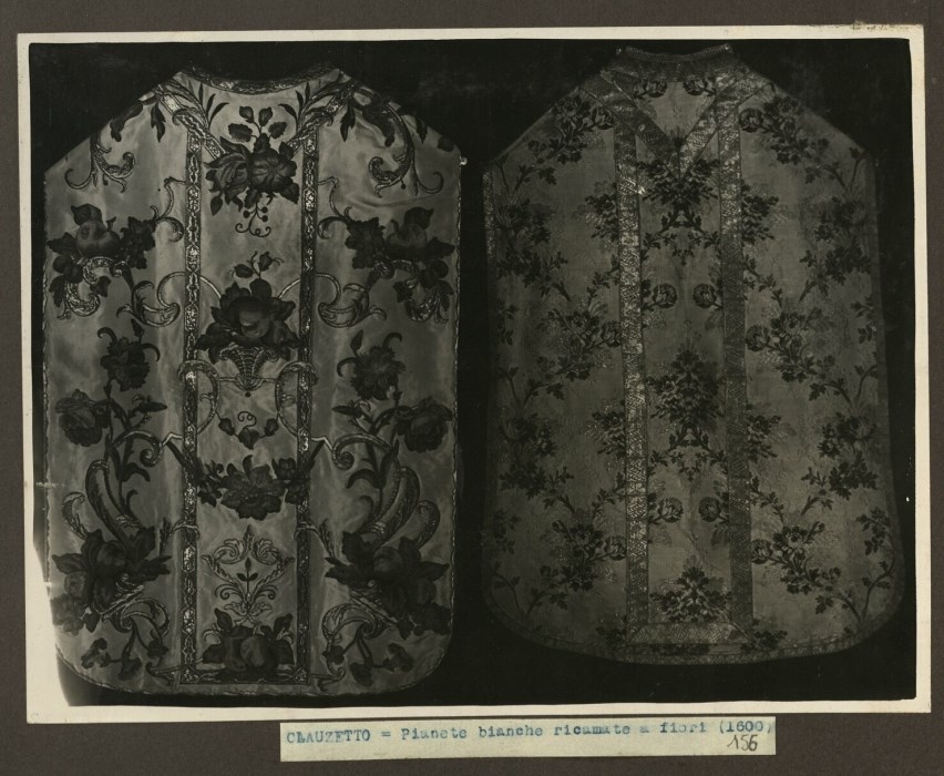 Riproduzione fotografica di due pianete bianche con ricami floreali conservate presso la Chiesa di San Martino a Vito d'Asio.