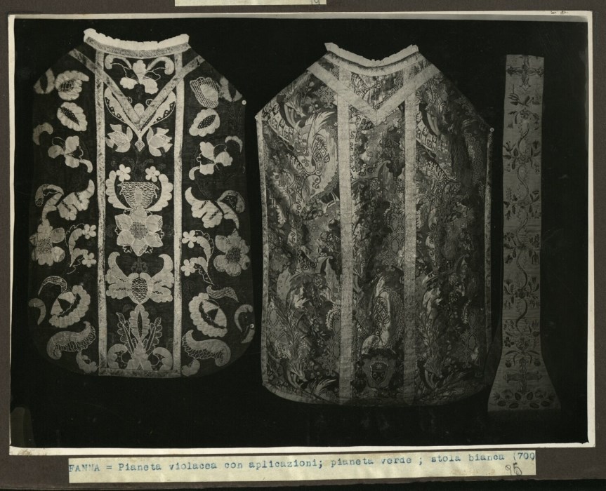 Riproduzione fotografica di una pianeta violacea con applicazioni, una pianeta verde ed una stola bianca (del '700) conservate presso la Chiesa di San Martino Vescovo di Fanna.