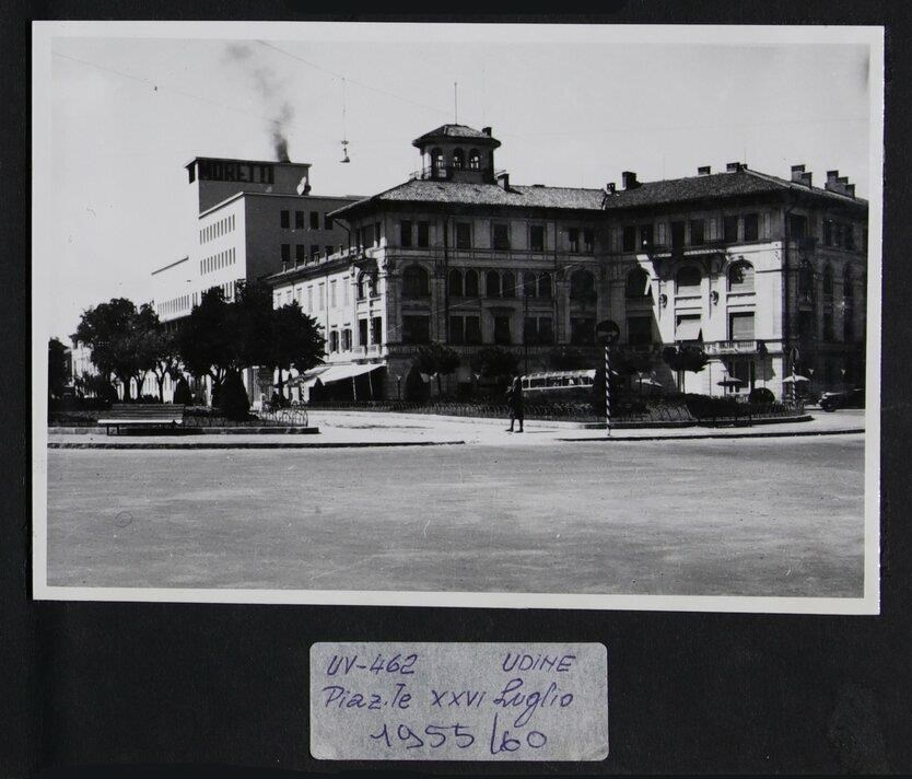 Udine: veduta di piazzale XXVI Luglio. In primo piano a sinistra, un'aiuola. A destra, Palazzo Moretti, annesso allo stabilimento del Birrificio Moretti (subito dietro), progettato dall'architetto Ettore Gilberti (1925-1926).