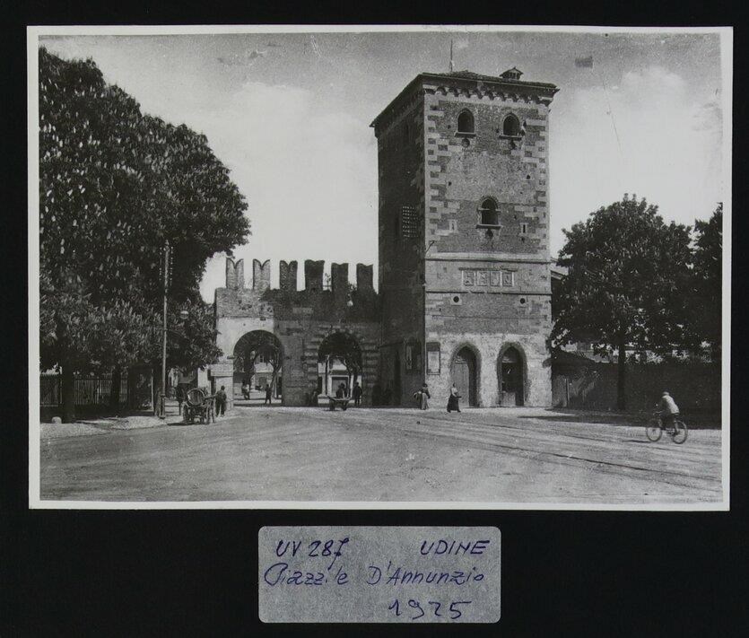 Udine, piazzale Gabriele D'Annunzio: veduta di Porta Aquileia (metà del Trecento), quinta cerchia muraria.
